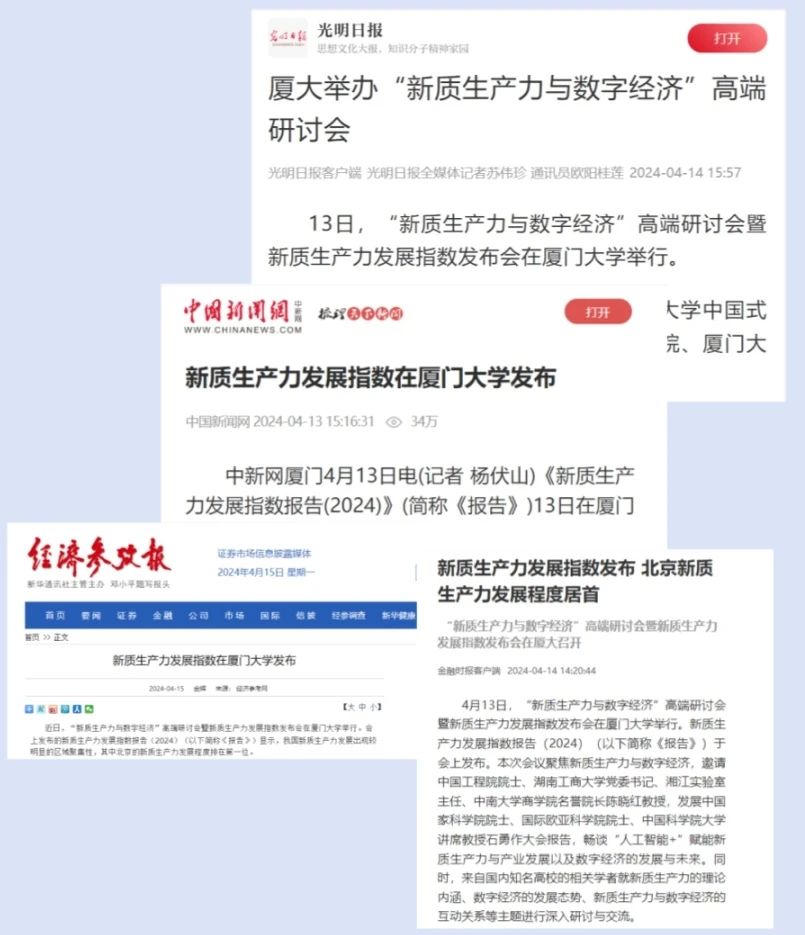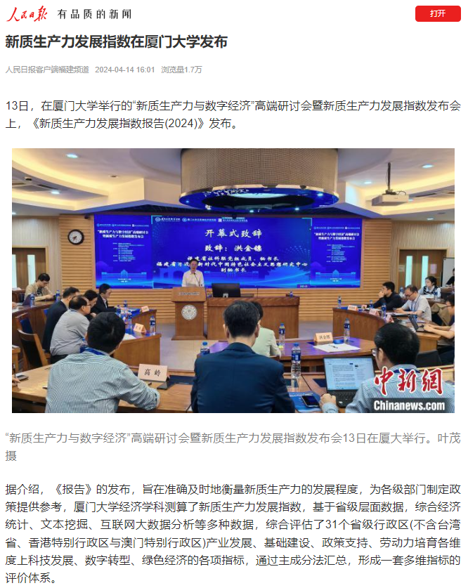 4月13日,由bat365官网登录入口经济学科和bat365官网登录入口中国式现代化研究院联合主办的“新质生产力与数字经济”高端研讨会暨新质生产力发展指数发布会在厦大经济楼举行。由厦大经济学科编制的新质生产力发展指数报告(2024)(下简称《报告》)于会上发布,引国内多家媒体关注,形成了报刊、电视、广播,以及新媒体平台的立体式报道。