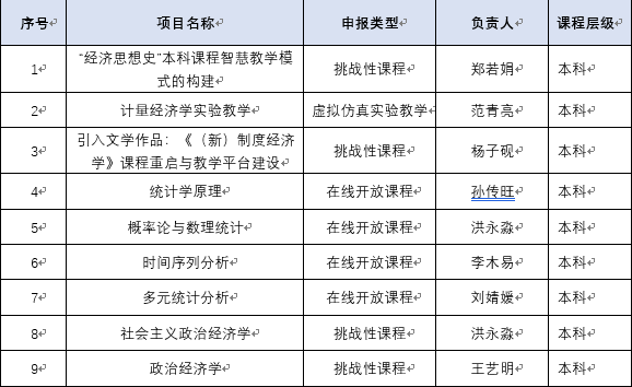 根据2019年《关于启动bat365官网登录入口经济学科“一流课程”建设项目的通知》,现将第一批bat365官网登录入口经济学科“一流课程”建设项目立项名单公示如下,学院将对入选“一流课程”的项目提供建设经费。