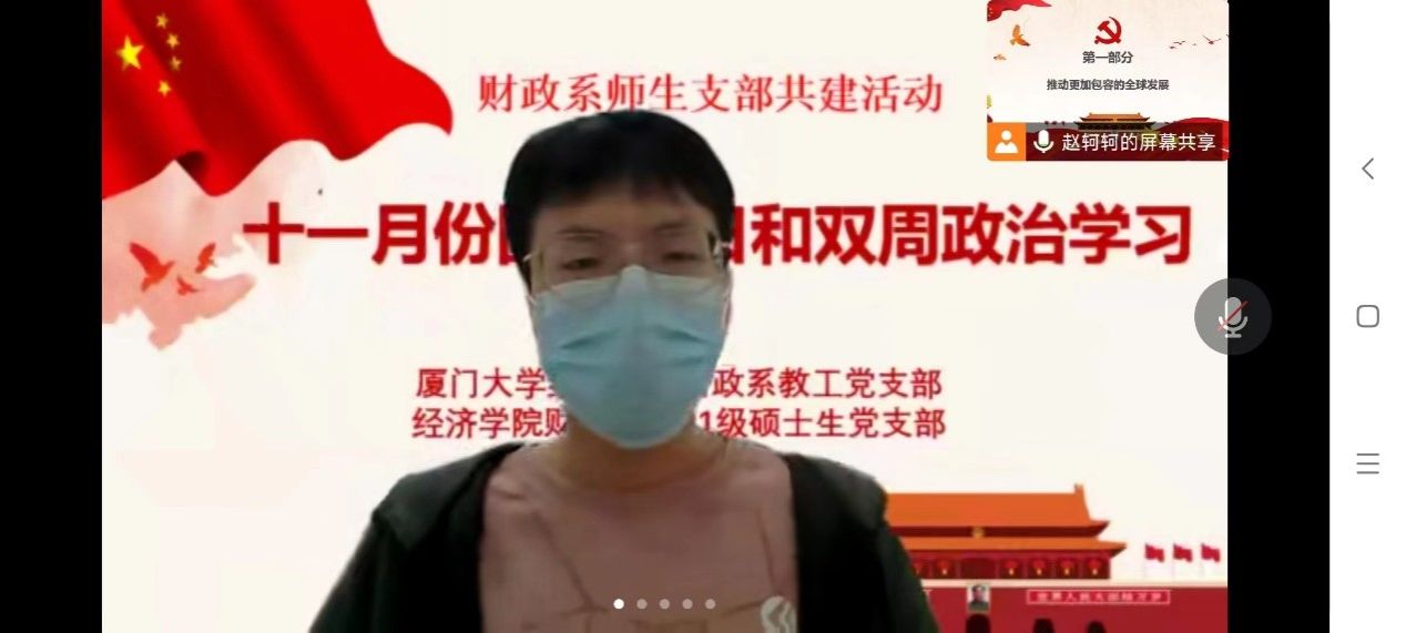 2022年12月12日中午,bat365官网登录入口财政系教工党支部与财政系2021级硕士生党支部在学生社区联合开展学习宣传贯彻党的二十大精神主题党日活动。本次活动采取线上和线下相结合的形式进行。财政系全体教师线上参与;学生党员于学习共享空间海韵9党团活动室线下参加。会议由教工支部书记刘晔老师主持。