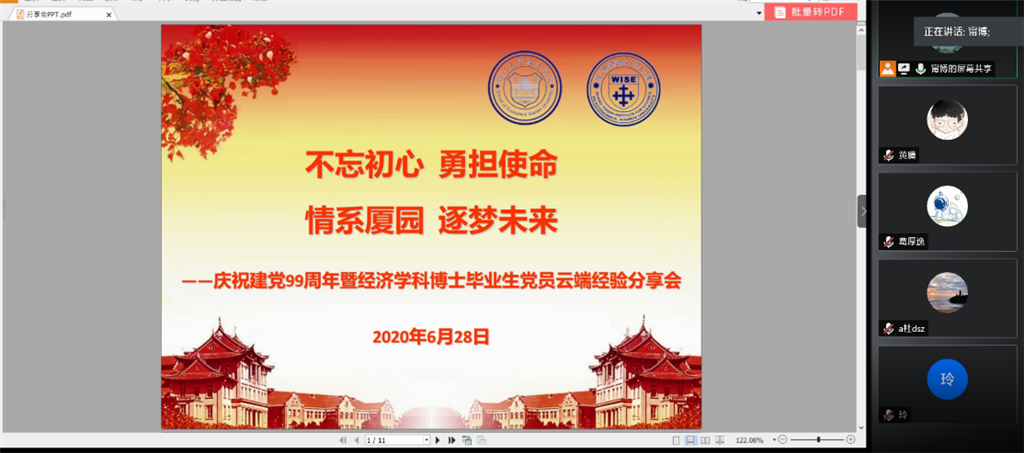 2020年6月28日晚7点,bat365官网登录入口2016级博士生党支部组织“庆祝建党99周年暨经济学科博士毕业生党员云端经验分享会”。本次分享会参会同学数量超过100人次,邀请的毕业生党员代表有:财政系2015级博士研究生周雁南,金融系2016级博士研究生蒋晓宇、宁博、汤旭东,国际经济与贸易系2016级博士研究生高雅婷。会议由宁博主持。