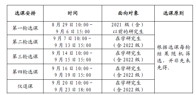 2022-2023年秋季学期研究生网上选课工作将于2022年8月29日(新生9月7日)正式开始,请各位同学及时登录选课系统进行相关选课操作。