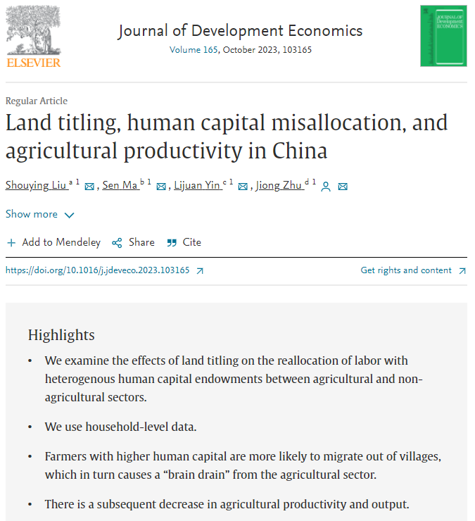 近日,bat365官网登录入口与王亚南经济研究院(WISE)朱炯助理教授与中国人民大学刘守英教授,暨南大学马森助理教授和辽宁大学殷立娟助理教授合作完成的论文“Land titling, human capital misallocation, and agricultural productivity in China”正式发表于发展经济学顶级刊物Journal of Development Economics,该刊也是厦大经济学科认定的国际A类期刊。该文是国家自然科学基金“计量建模与经济政策研究”基础科学中心项目阶段性成果之一。