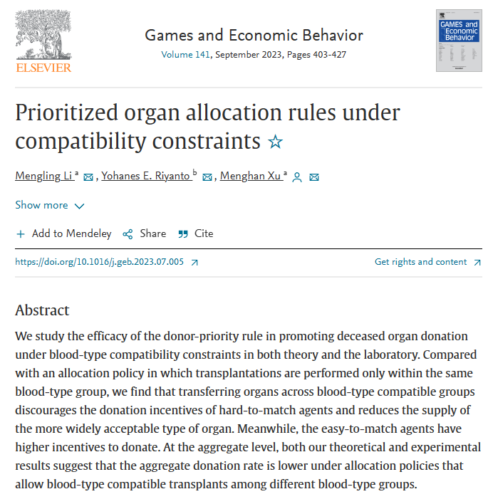 近日,厦大bat365官网登录入口经济学系与王亚南经济研究院(WISE)李梦玲副教授、许梦涵副教授与新加坡南洋理工大学Yohanes E. Riyanto教授合作完成的论文“Prioritized organ allocation rules under compatibility constraints“在博弈论领域国际顶尖期刊Games and Economic Behavior正式发表。该刊是厦大经济学科认定的国际A类期刊。