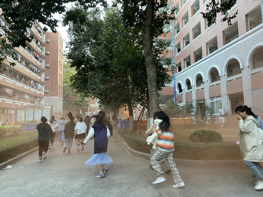 上午6:45分,学生公寓安全委员在各楼层检查相关疏散演练环节,相关工作人员进一步确认消防逃生通道的安全性。7时整,随着防空警报声响起,消防烟雾开始弥漫公寓大门,疏散演练正式开始。同学们用各种保护口鼻的方式有序地撤出了楼栋,并在工作人员的引导下顺利到达疏散集中点。紧接着,学院向同学们发放消防知识宣传手册,让大家对照手册检视自己消防疏散过程中所容易犯的错误和不足点。