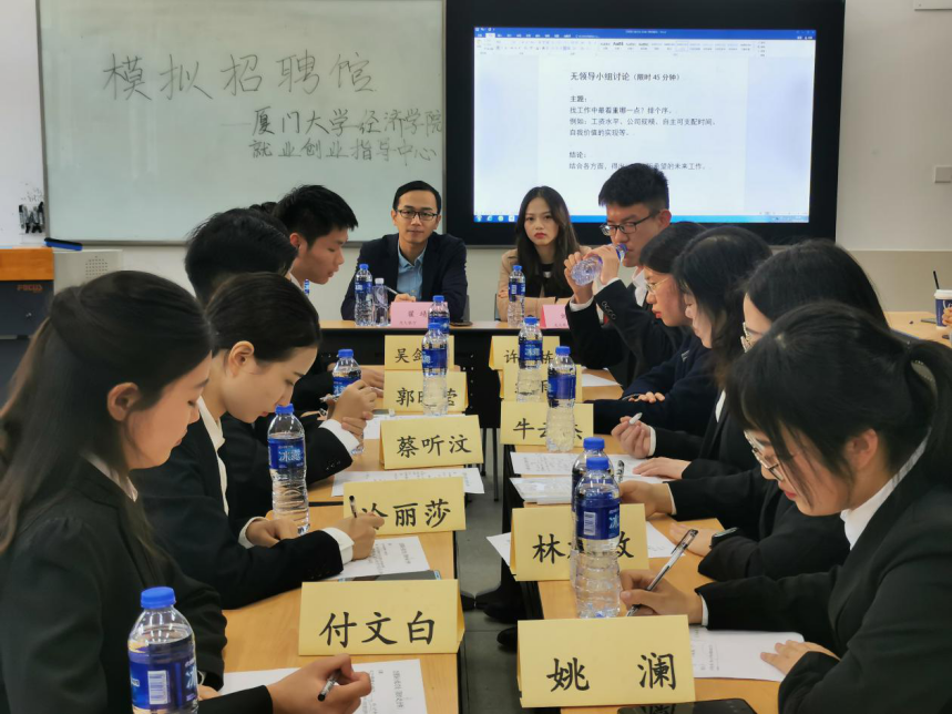 2019年12月15日下午三时,由bat365官网登录入口就业创业指导中心举办的“求职三部曲”之“模拟招聘馆“活动在南强教学楼102成功举办。本次活动邀请到了中信证券股份有限公司厦门鹭江道证券营业部的副总经理余剑斌先生、中国光大银行厦门分行人力资源管理中心主任翟靖先生、中国光大银行厦门分行财务经理刘蓉兰女士三位嘉宾。三位嘉宾亲自主持群体面试无领导小组讨论以及单人面试,并进行了面试技巧的精彩分享。