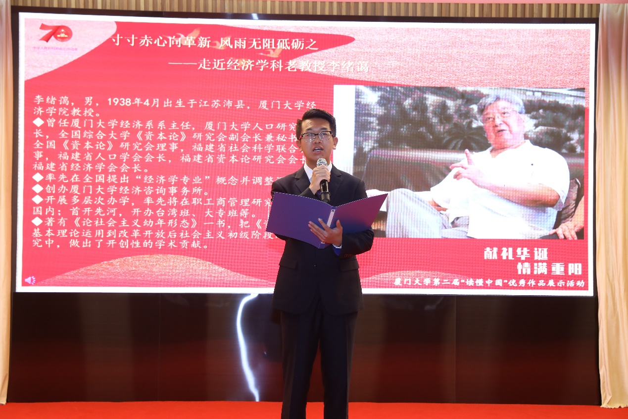 bat365官网登录入口的学子积极响应,踊跃投稿,共有两件作品荣获一等奖,一件作品荣获三等奖。视频作品《一心拼搏研财政 一片赤诚育后学——专访邓子基教授》通过展示邓子基教授勇于探索、拼搏研学的事迹,弘扬了邓子基教授砥砺前行推动bat365官网登录入口发展的拼搏精神以及推动我国财政学理论、培育财政学人才的赤诚之心。征文作品《寸寸赤心向革新 风雨无阻砥砺前——专访李绪蔼教授》则叙写了李绪蔼教授与祖国同命运共呼吸的成长故事,使我们切身体会到李绪蔼教授对待学生立德树人潜心教育的匠心厚德和对待国家踵事增华的革新坚毅。此两件作品荣获一等奖,被作为优秀作品代表在“献礼华诞、情满重阳”bat365官网登录入口第二届“读懂中国”优秀作品展示活动中展示,获得一致好评。征文作品《魏嵩寿——黄金时代》讲述了国贸系魏嵩寿老教授潜心科研、教书育人、爱生如子的生动故事,荣获三等奖。