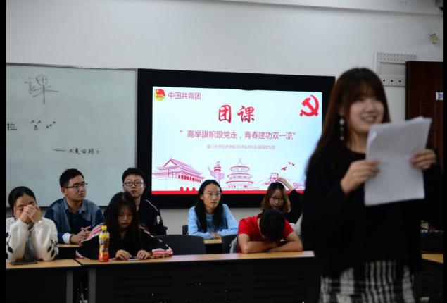 “我们是五月的花海,用青春拥抱时代;我们是初升的太阳,用生命点燃未来。五四的火炬,唤起了民族的觉醒。壮丽的事业,激励着我们继往开来。光荣啊,中国共青团,光荣啊,中国共青团,母亲用共产主义为我们命名,我们开创新的世界”当中国共青团团歌响起的那一刻,在各团支部团支书的主持下,团课拉开了帷幕。团课教育以党史,团史,团知识等为主要内容,寓乐于学,不乏趣味性地起来,旨在教育引导广大青年团员永远跟党走,增强广大团员的政治意识,组织意识,责任意识和模范意识。教育广大青年团员做好社会主义的主人翁,不随波逐流,不人云亦云,做党的助手和后备军,做党联系青年的桥梁和纽带,要担任起为党源源不断输送新鲜血液的重任。