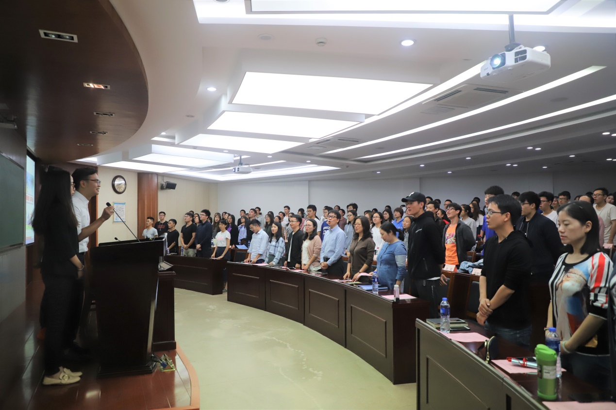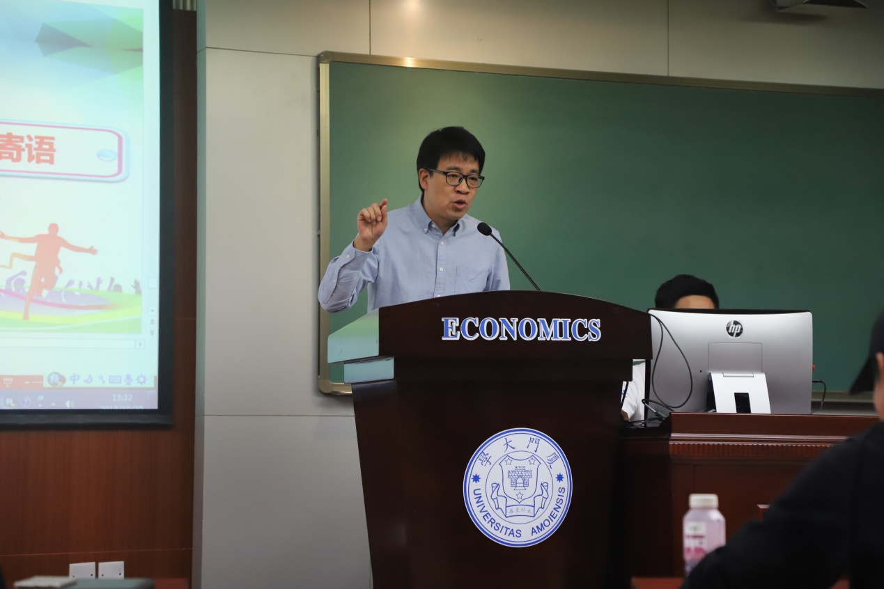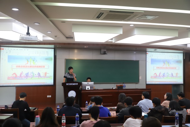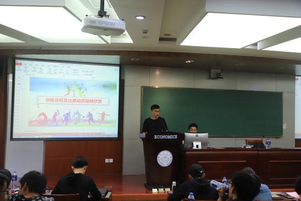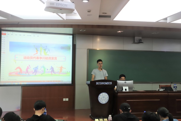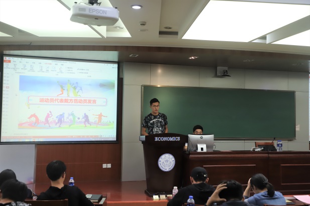 随后王祥蔚向大家介绍了校运会的赛程、后勤人员安排、重点比赛规则以及注意事项,帮助运动员顺利参赛。本科生运动员后勤负责人张佳鹏汇报了后勤物资的准备以及应急措施,为在场的运动员们吃了一颗定心丸。医疗组负责人冯杨媛向大家详细地介绍了运动技巧及医疗等注意事项,包括赛前赛后的饮食起居,提醒运动员们自己保持良好竞技状态。而运动员代表本科生戴方岳、研究生李川的发言,共同表达了对后勤同学们辛苦付出的感激以及必胜的决心与勇气。戴方岳深感为经院出征的荣光和使命,表达在艰苦训练后必胜的信心;李川讲述了自己面对亲人离世,在工作人员、运动员的陪伴和鼓励下,克服悲伤、化解忧郁,仍坚持不懈地训练,体现了我们经院健儿不懈奋斗的体育精神!现场的老师同学们深受感染,掌声雷动。