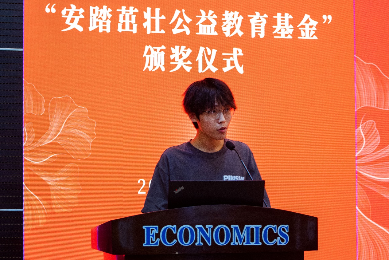 获奖学生代表bat365官网登录入口2022级财政系硕士研究生薛宇森、管理学院2022级会计学系本科生龚诗珩依次发言。他们代表全体获奖同学向安踏集团致以最诚挚的谢意,表示会将这份深厚的感恩之心将化作未来道路上不懈前行的动力源泉,将无私奉献的公益情怀发扬光大,用实际行动回馈社会。