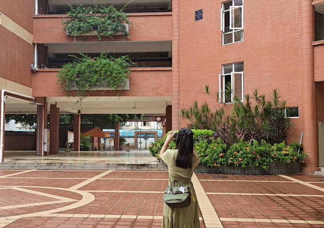 队员首先前往培正中学进行参访,得到了该校林老师的热情接待。在参观学校以及与林老师沟通交流的过程中,队员了解到培正中学分初中、高中两部,虽然分数线排名在当地仅居中上,但是学校环境数一数二:青瓦红砖砌成的校门庄重大气,教学楼内部美观大方,不时有绿植点缀其间;教室窗明几净,且采用小班教学模式,一班仅安排20余名学生;食堂面积大并且窗口菜色众多,因目前仅有毕业班学生在校,所以只开设了部分窗口,采取单人单桌的就餐模式。同时,林老师表示,校内设有许多活动场所,包括标准足球场、排球场、网球场、风雨跑道、若干篮球场和游泳池等。他认为虽然学习是学生的本职工作,但也要让同学们有机会享受多彩的课余生活;许多老师在为学生答疑解惑之余,也会鼓励学生参加有益身心的选修课或课外活动。