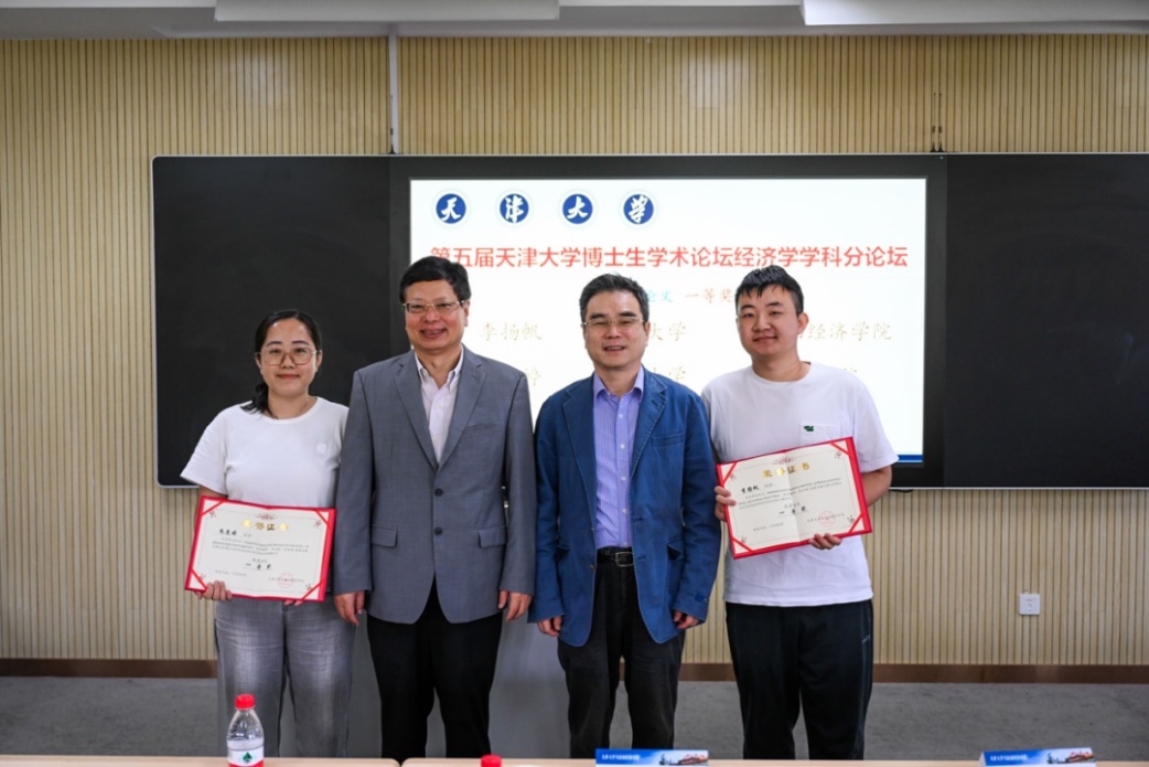 洪永淼教授、张俊森教授与荣获优秀论文一等奖的博士生同学合影