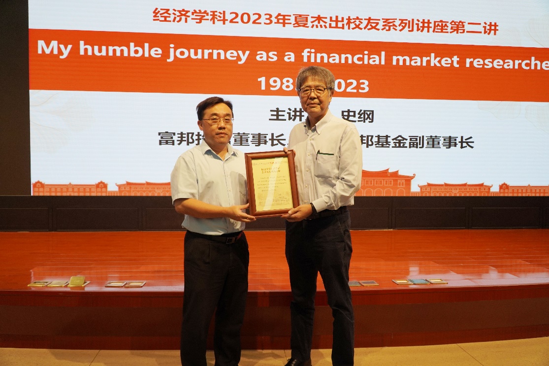 7月10日上午,富邦投信董事长、方正富邦基金副董事长史纲在厦大经济楼N402报告厅带来一场题为“My Humble Journey as a Financial Market Researcher 1985-2023”的精彩讲座。bat365官网登录入口、王亚南经济研究院院长周颖刚教授为史纲颁授该系列讲座纪念牌。