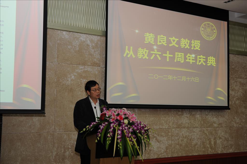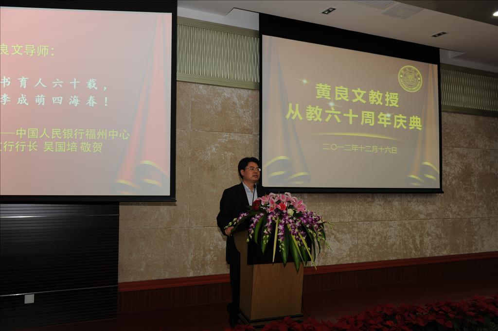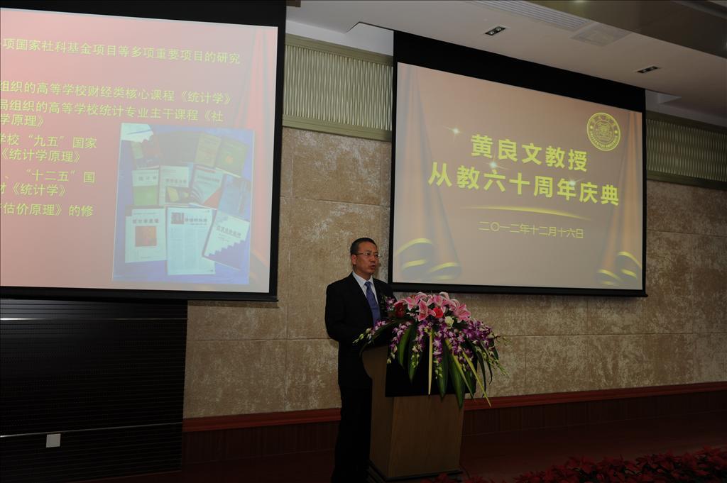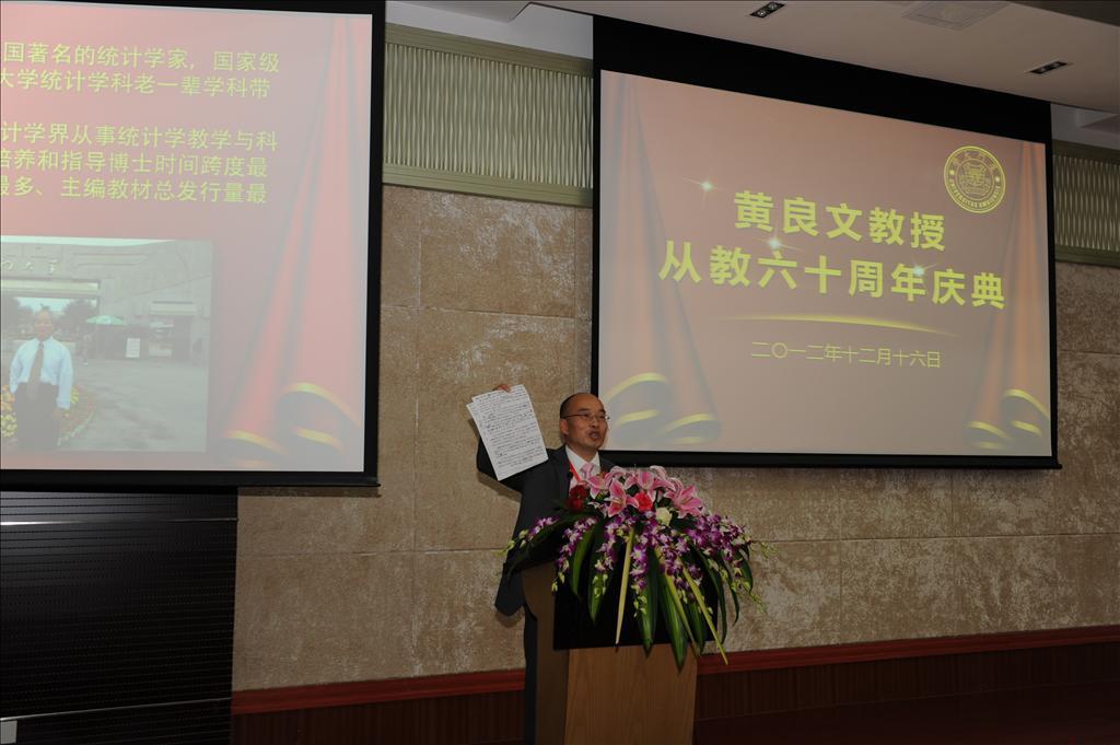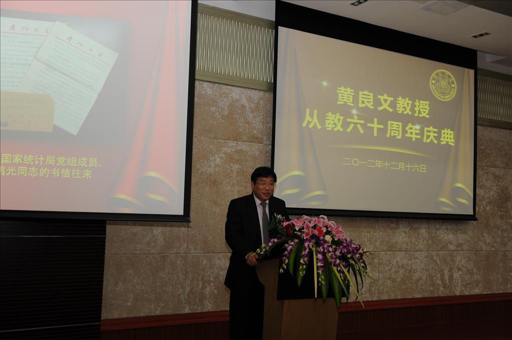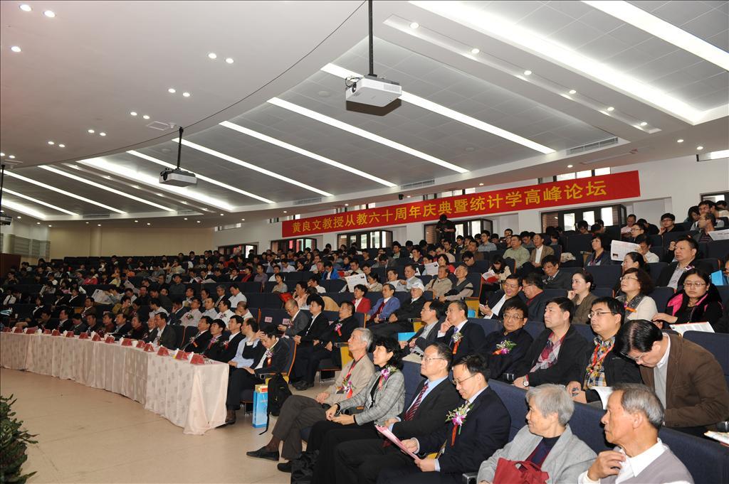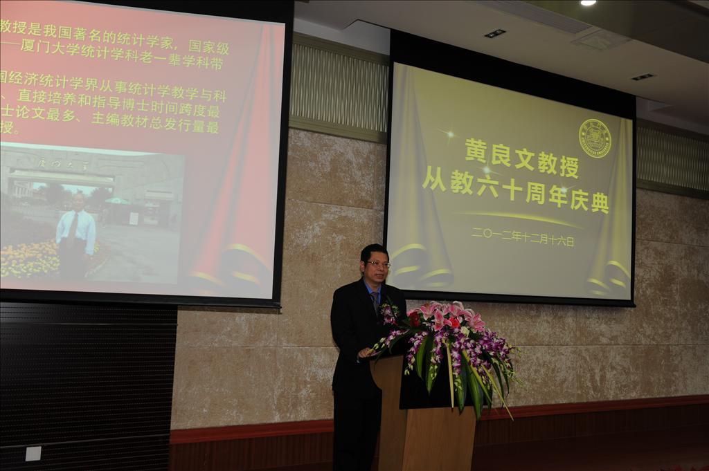 本次庆典上,中央政治局常委张高丽专门委托秘书致予贺辞。国家统计局副局长徐一帆,厦门市委常委、宣传部部长叶重耕,bat365官网登录入口党委副书记、副校长李建发,对外经贸大学校长施建军,西南财经大学统计学院教授庞皓,中国人民银行福州中心支行行长吴国培,天津财经大学统计学院院长肖红叶,中国统计出版社社长严建辉,bat365官网登录入口原副校长吴世农,福建省统计局副局长陈志强,中国统计学会常务副秘书长许亦频,中国人民大学统计学院院长金勇进,bat365官网登录入口、王亚南经济研究院洪永淼,bat365官网登录入口党委书记雷根强,黄良文教授的众多弟子以及亲朋好友和我校bat365官网登录入口师生代表400余人出席了庆祝大会。bat365官网登录入口统计系副主任陈建宝主持大会。