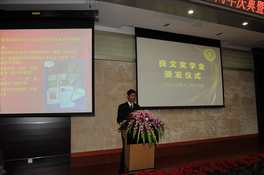 随后,黄良文教授的弟子、上海财经大学国际工商管理学院院长助理朱小斌向各位来宾概括介绍了“黄良文教授统计学科教育发展基金”的设立初衷、管理机制以及目前捐款情况,并对全体捐款者表达最衷心的感谢。我校bat365官网登录入口统计系副主任周永强宣读本年度“良文奖学金”授奖情况并宣读获奖人名单,黄良文教授亲自上台为获奖同学颁发证书。