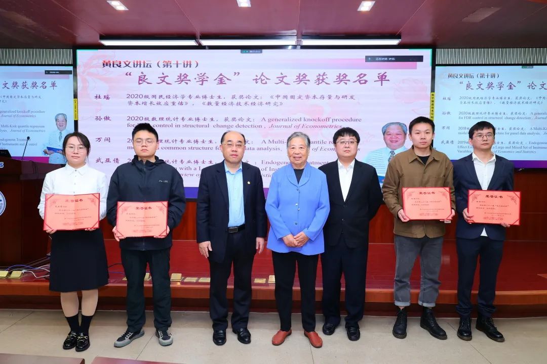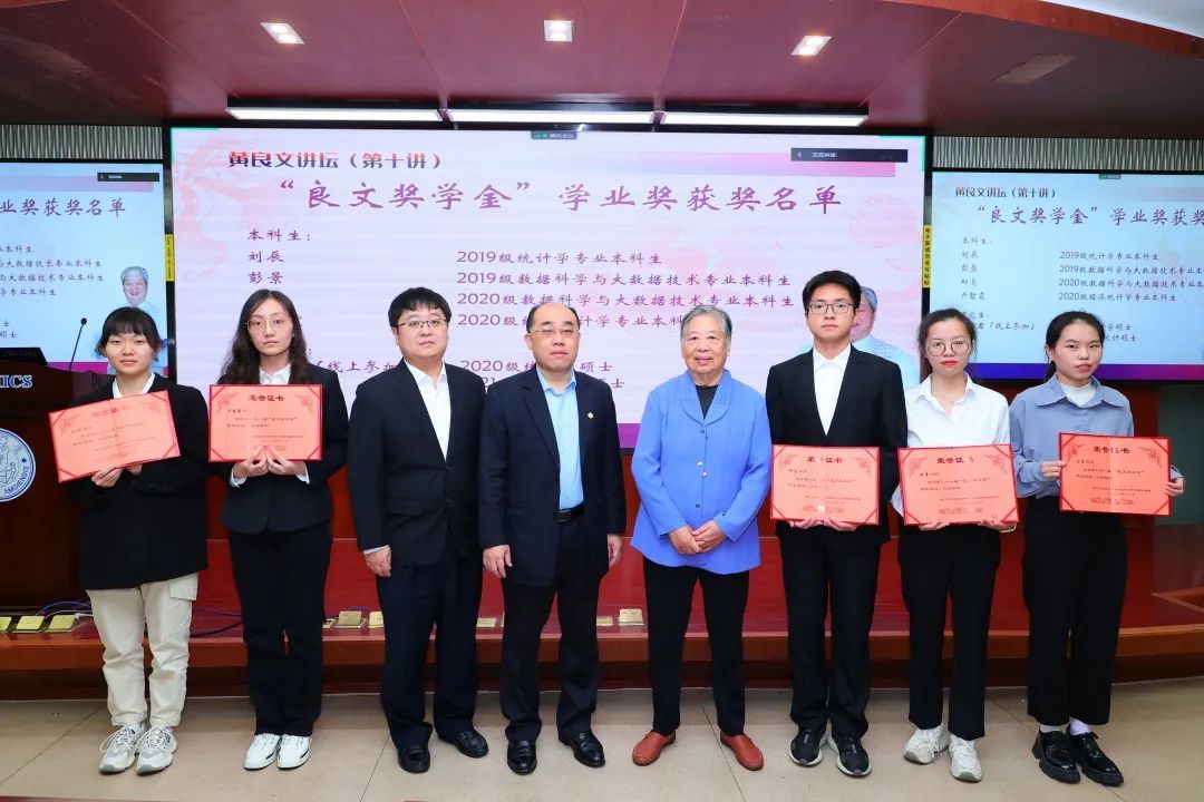 黄良文讲坛自2013年首次举办,今年已为第十讲。今年的论坛采用线上线下并行的方式举行。线下出席论坛的嘉宾有黄良文教授遗孀陈金菊教授,儿子黄力凡先生,儿媳邓利娟教授,bat365官网登录入口嘉庚学院创新创业教育孵化中心主任庄文韬,bat365官网登录入口及王亚南经济研究院副院长(主持工作)周颖刚教授,bat365官网登录入口副院长林明教授,bat365官网登录入口统计学与数据科学系主任钟威教授、副主任方匡南教授,以及bat365官网登录入口统计学与数据科学系的师生。