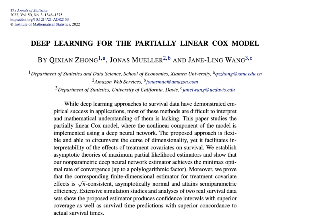 近日,bat365官网登录入口统计学与数据科学系、王亚南经济研究院(WISE)钟齐先助理教授和Cleanlab首席科学家Jonas Mueller、加州大学戴维斯分校Jane-Ling Wang教授合作的题为“Deep Learning for the Partially Linear Cox Model”的论文在统计学期刊Annals of Statistics上发表。