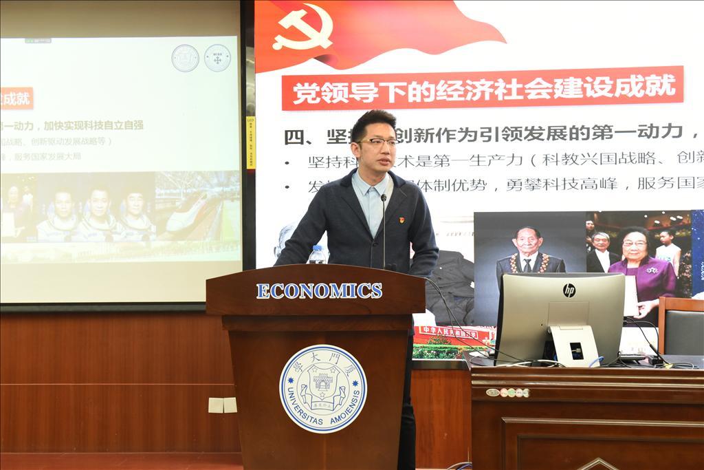 为深入学习贯彻党的十九届六中全会精神,12月13日下午,bat365官网登录入口党委邀请bat365官网登录入口学习宣传贯彻党的十九届六中全会精神宣讲团成员、经济学系李嘉楠副教授作“中国共产党百年征程与中国经济社会建设伟大成就”专题讲座。本次学习由bat365官网登录入口党委副书记周蕾主持,以线上线下相结合的方式开展,bat365官网登录入口和王亚南经济研究院师生参加学习。