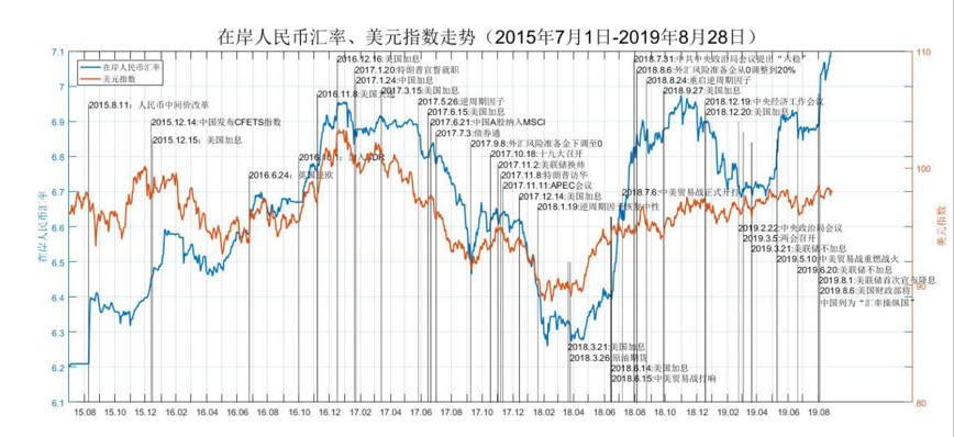 从图2可以看出,受美国对中国加征关税预期等影响,今年5月和8月均出现人民币兑美元汇率大幅贬值的现象,并在8月5日人民币离岸和在岸汇率双双“破7”,人民币对一篮子货币也有明显下降趋势。这是十年来人民币汇率首次“破7”,主要源于中美贸易摩擦再度超预期升级以及强美元等因素。
