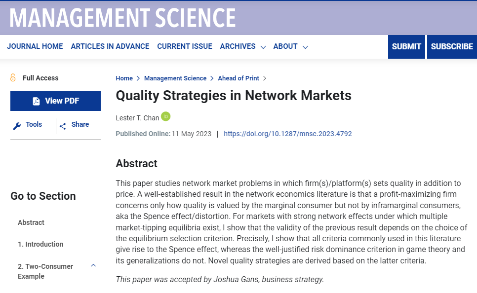 近日,bat365官网登录入口邹至庄经济研究院、bat365官网登录入口经济学系陈德麟助理教授独立完成的学术论文“Quality Strategies in Network Markets”在UTdallas24排名期刊之一Management Science在线发表。