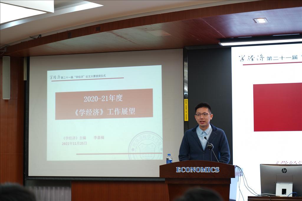 《学经济》主编李嘉楠作工作展望,肯定了一年来《学经济》取得的成绩,同时也指出在自媒体平台迅速发展的时代,“经经有道”如何能脱颖而出、吸引更多人群?公众号应该坚持 “科研导向”还是“学生导向”,《学经济》面临着更大的机遇与挑战。李老师希望《学经济》能更多地走向学生的内心世界,更好地打造思政育人平台、师生交流平台。为此,《学经济》编辑部在颁奖仪式上推出了2021年宣传视频。