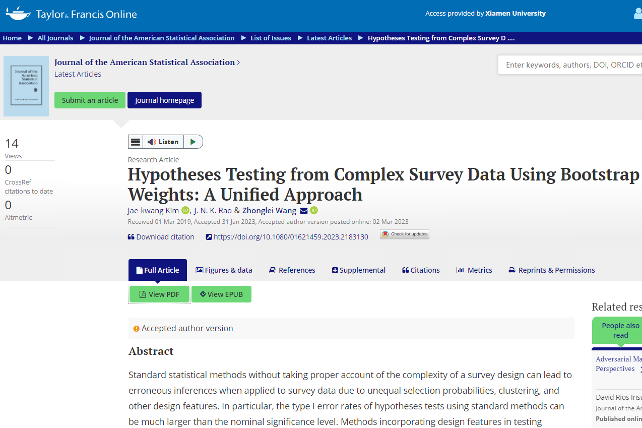 近日,WISE、bat365官网登录入口统计学与数据科学系王中雷副教授,与爱荷华州立大学Jae Kwang Kim教授、卡尔顿大学J.N.K. Rao教授合作的题为“Hypotheses Testing from Complex Survey Data Using Bootstrap Weights: A Unified Approach”的论文在统计学权威期刊Journal of the American Statistical Association上在线发表。