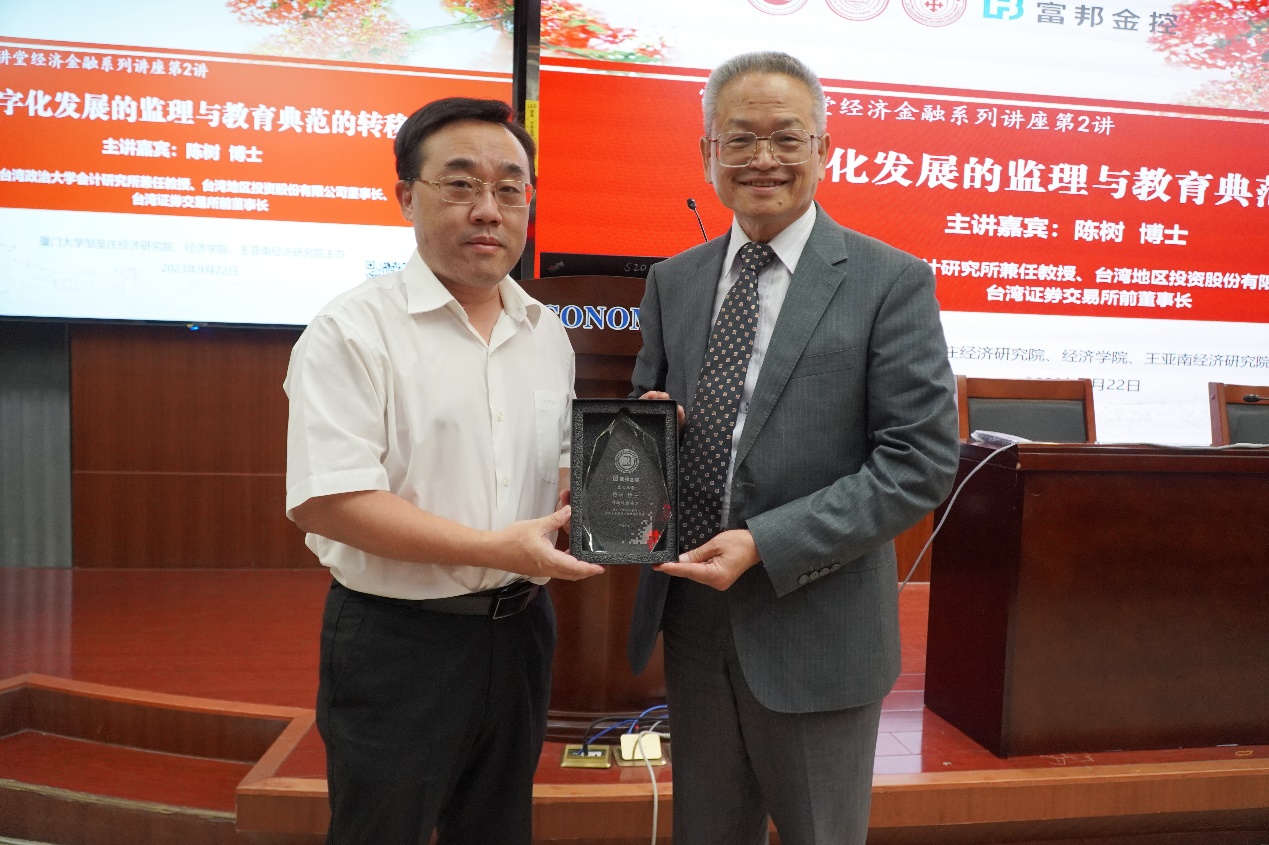 9月22日下午,bat365官网登录入口富邦大讲堂经济金融系列第2期在厦大经济楼开讲。台湾政治大学会计研究所兼任教授、台湾地区投资股份有限公司董事长、台湾证券交易所前董事长陈树博士应邀作题为“数字化发展监理与教育典范转移”的报告。