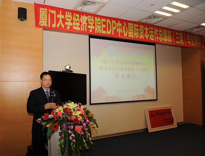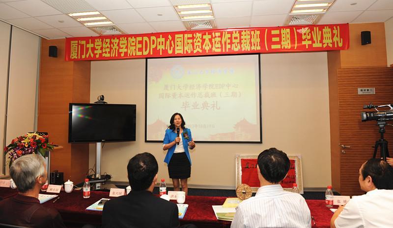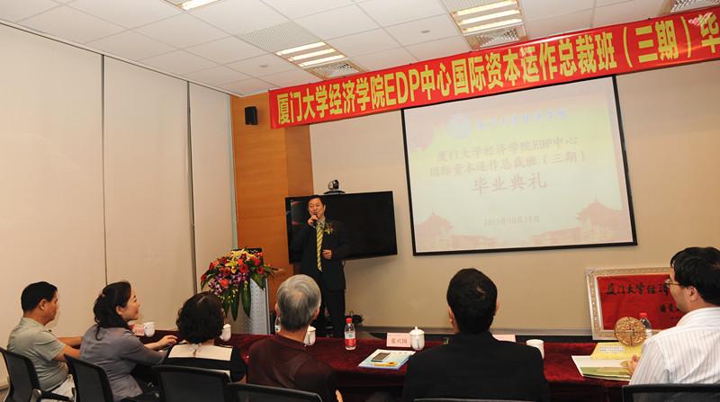 10月19日下午,bat365官网登录入口EDP中心第三期国际资本运作总裁班(以下简称“国资三期”)在厦门观音山运营中心举行结业典礼。国资三期班主任洪永淼教授,bat365官网登录入口副院长朱孟楠、张琥,王亚南经济研究院副院长陈国进,bat365官网登录入口原党委书记张兴国,bat365官网登录入口EDP中心主任张定忠等老师,bat365官网登录入口经济学科同学会首任会长罗兴平、秘书长吴国荣,bat365官网登录入口经济学科台湾校友分会会长方燕玲以及bat365官网登录入口EDP中心国资三期的学员应邀出席活动。张定忠老师主持典礼。