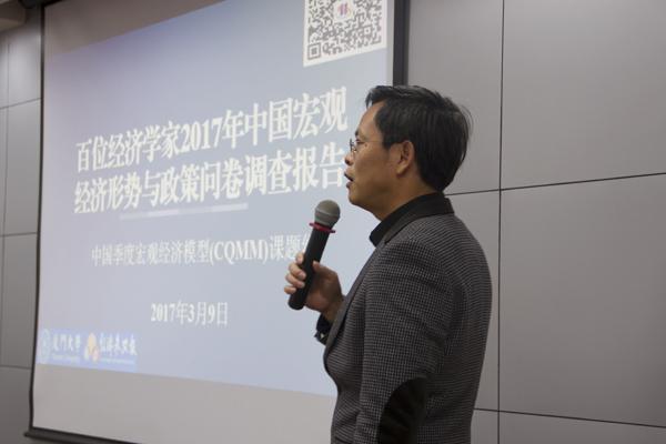 之后,陈贵富教授展示了《百位经济学家2017年中国宏观经济形式与政策问卷调查报告》。报告包括针对2017年世界经济形势,中国经济形势以及中国宏观经济政策预测向领域专家提出的20个问题,并将课题组与调查专家预测结果作比较。陈贵富教授通过图表以及有趣的点赞方式,直观的向师生展现了报告结果,在场师生受益匪浅。