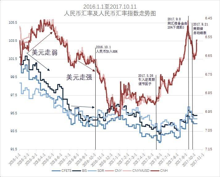 2017年5月26日,人民银行宣布引入逆周期调节因子,把“收盘价+一篮子”的中间价定价机制,转变为“收盘价+一篮子+逆周期因子”的定价机制,主要目的是适度对冲市场情绪的顺周期波动,缓解外汇市场可能存在的“羊群效应”。此后一段时间,尽管美联储加息,人民币掀起了一轮上涨态势,说明逆周期调节因子和加强资本管制的短期效果是非常显著的,扭转了市场上的单边贬值预期,有助于稳定资本流动与外汇储备。2017年9月8日,央行将购汇准备金由20%调整为零等因素的影响,人民币汇率开始呈现持续回调的态势。