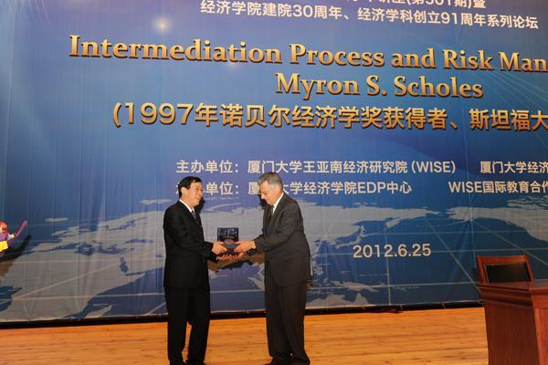 6月25日上午, 1997年诺贝尔经济学奖获得者Myron S. Scholes教授应王亚南经济研究院与bat365官网登录入口的邀请,做客bat365官网登录入口南强学术讲座暨bat365官网登录入口建院30周年、经济学科建立91周年系列论坛,发表了题为“Intermediation Process and Risk Management”的学术演讲。