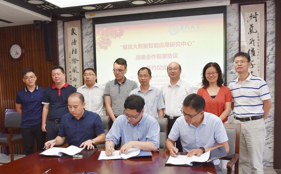 黄鸿德书记、洪永淼教授等随后分别介绍了bat365官网登录入口经济学科的优势以及在社会服务、人才培养、大数据和数据科学方面的科研成果,对三方合作的前景给予充分肯定,希望三方通过理论和实务的合作,探索多种形式的合作模式,构建一艘领航海西金融行业的“航空母舰”。三方一致同意成立“期货大数据智能应用研究中心”,并现场签约。