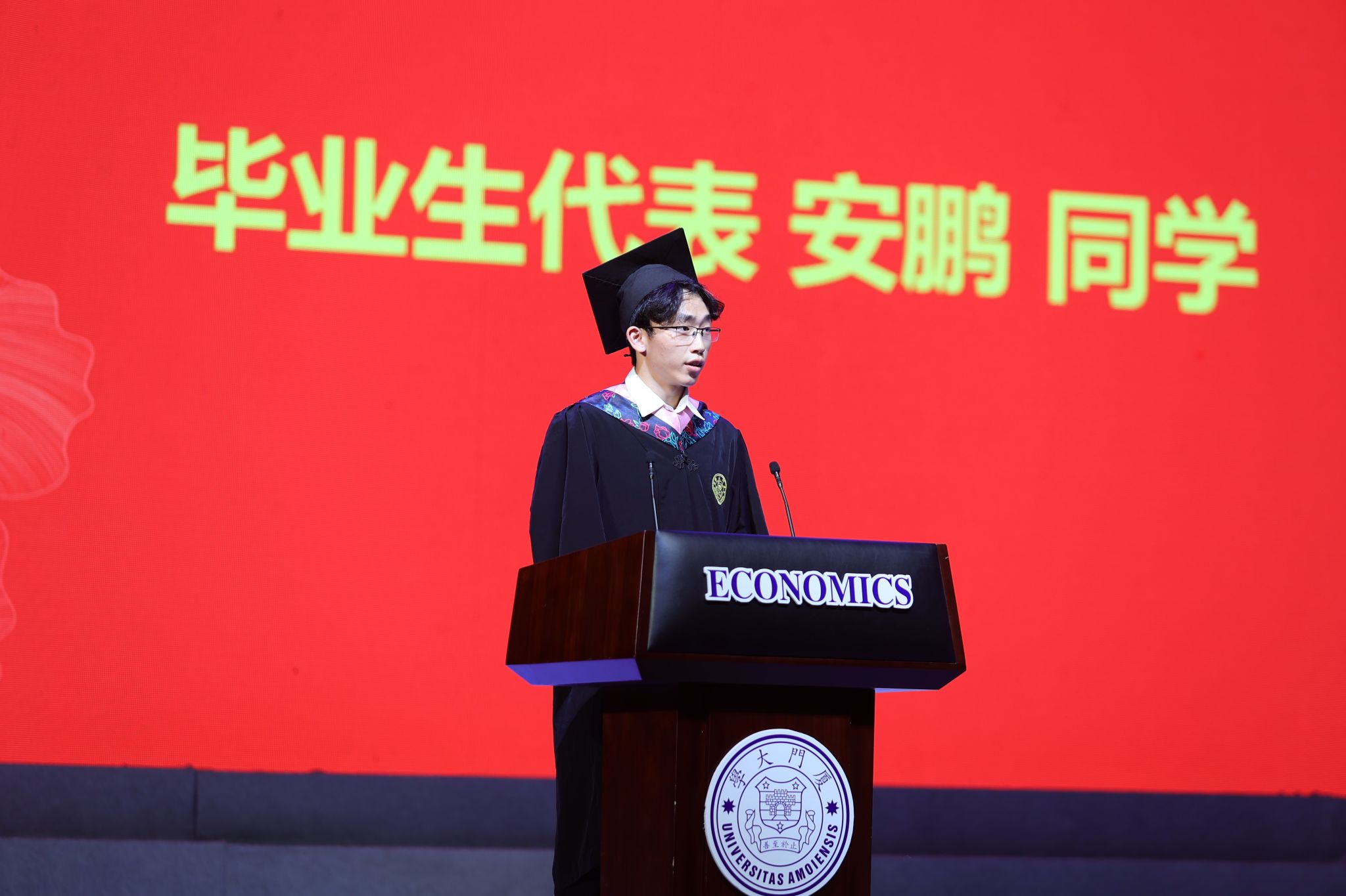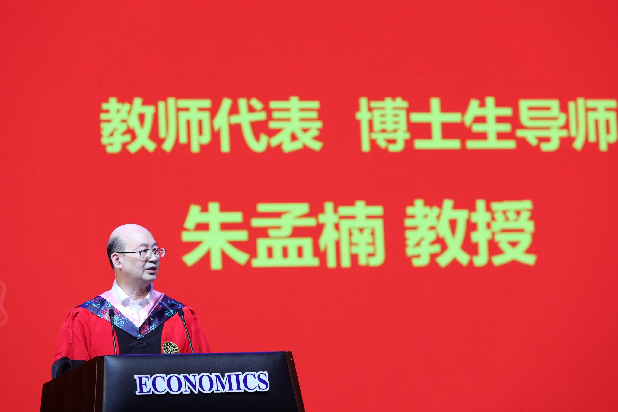 博士生导师朱孟楠作为教师代表发言,他回忆了自己学生时代的求学故事,表达了对经济学科、对厦大的热爱。同时他也对即将毕业的学子们提出了几点殷切希望:第一,要保持激情,拥有自信,敢于创新;第二,坚韧不拔,从容应对,迎难而上;第三,学会谦逊、善良,富有热情;第四,时刻怀有感恩、敬畏之心,珍惜友谊和荣誉;第五,登高望远,胸怀天下。最后,朱教授祝福大家:通过自己的努力、团结合作,创出一片新天地,为国家富强、中华民族伟大复兴百年梦想的实现、人类命运共同体的构建,作出厦大人特殊的贡献!