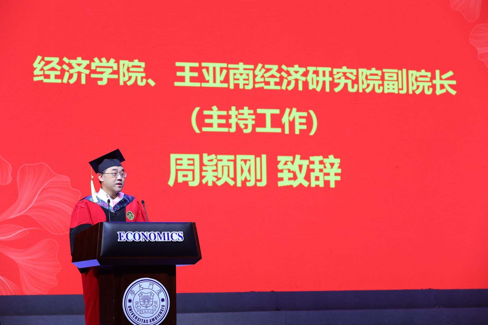 bat365官网登录入口、王亚南经济研究院副院长(主持工作)周颖刚首先致辞,他代表经济学科全体老师,为1117名毕业生们送上诚挚的祝贺,并提出三点期望和叮嘱:一、希望同学们洞察大局,顺势而为。把自己发展的“小目标”融入世界百年未有之大变局和中华民族伟大复兴这“两个大局”;二、希望同学们记得青春里那个愿意奋斗的自己,让“自强不息”的校训和“自讨苦吃”的精神助力经济学子行稳致远;三、希望同学们心怀感恩,主动作为,回馈家庭、母校、社会,让嘉庚精神不断延续传承。