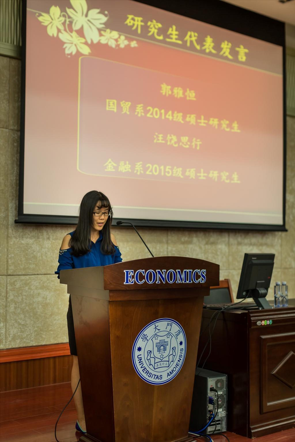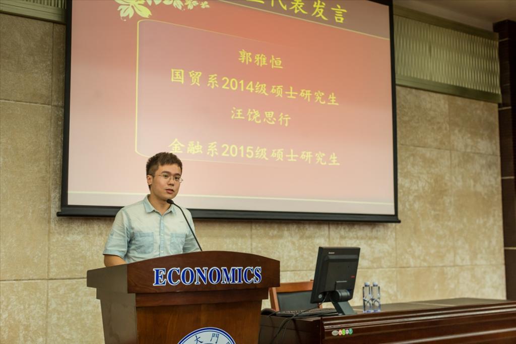 随后,老生代表、国际经济与贸易系世界经济专业2014级硕士郭雅恒同学发言。郭雅恒同学回顾了过去一年来作为一名经院研究生在学院的生活,谈到了经院严谨规范的学风、学院里良师益友们的帮助以及丰富多彩的活动,并鼓励新生们在bat365官网登录入口这一广阔的平台上尽情展现自己的风采,做好充分的准备迎接未来研究生生涯的挑战。