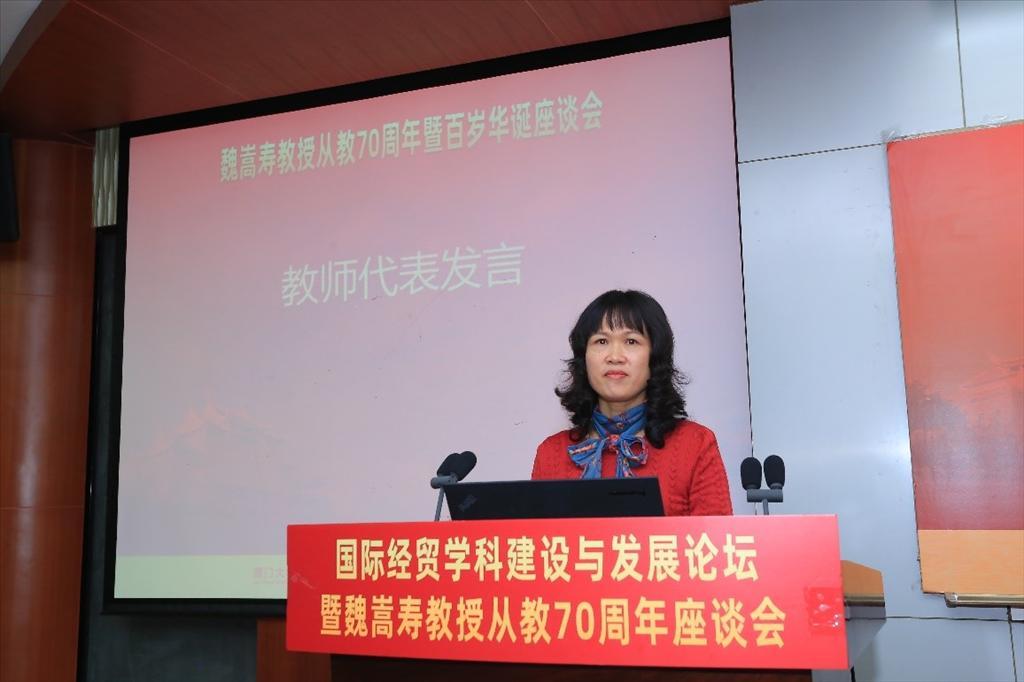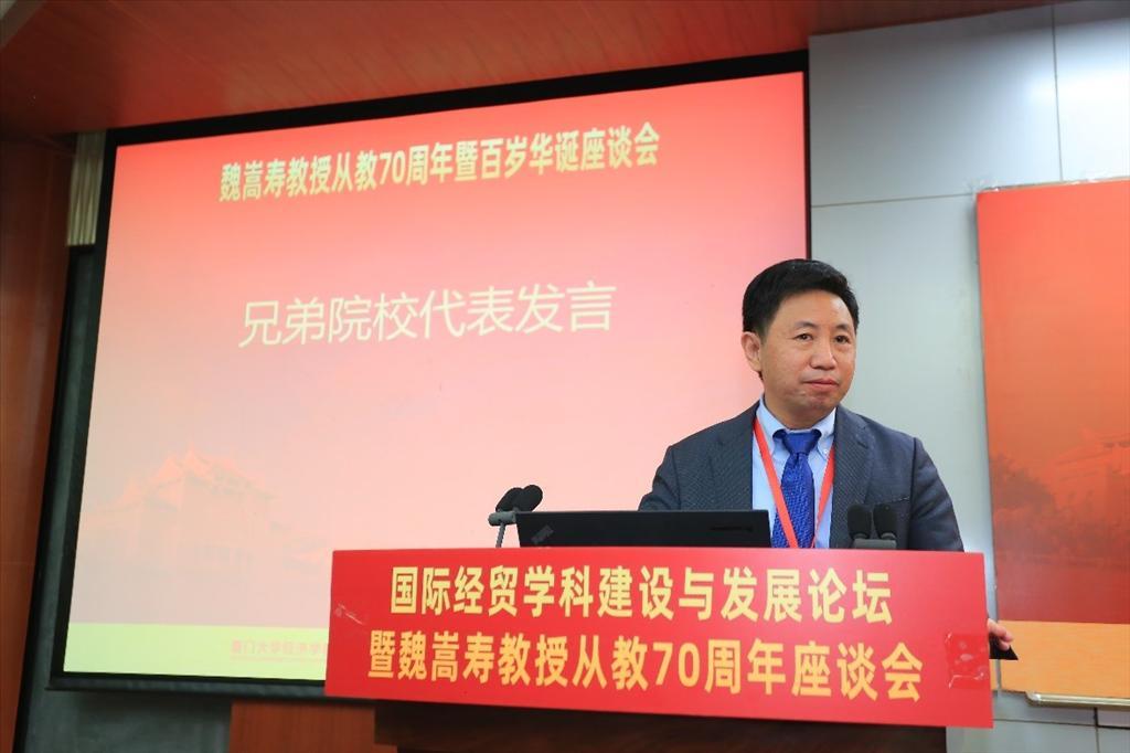 随后,南开大学李坤望教授作为兄弟院校代表发言。他提到,南开大学与bat365官网登录入口在经济学科发展方面一直保持着密切的学术交流,他希望未来两校在学科建设方面能够携手共进,共创未来。他提到,魏嵩寿教授从教70周年的经历充分诠释了“德润身而仁者寿”,在他漫长的教育生涯中,在国际贸易学科建设尤其是人才培养和研究方面成绩卓著。今天举办这样的庆祝活动是为了感受魏嵩寿教授的国家情怀,学习他的为师之道,也祝愿魏嵩寿教授福寿满堂、欢乐远长。