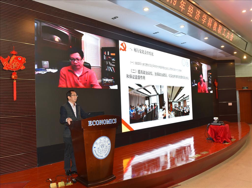 随后,黄鸿德对2018年的党建和思想政治工作进行回顾,并对2019年的工作重点进行部署。2018年,学院党委组织继续深入学习贯彻习近平新时代中国特色社会主义思想和党的十九大精神,紧紧围绕中心、突出重点,认真落实抓党建主体责任,扎实开展党建活动,加强师生思想政治教育,努力为经济学科改革、发展、稳定提供了坚强的思想保证和组织保证。