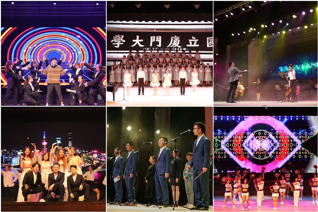 文艺汇演分为“青春力量”“历史长河”“融汇中西”“文体浪潮”“时代风采”“未来无限”六个篇章,聚焦时代与社会的变迁,为观众缓缓呈现中华人民共和国成立七十年以来的发展历程。舞蹈《追梦学子》以积极进取的青年学生为追梦时代的鲜活注脚,描绘了一幅全民奋斗的美丽画卷,表现新时代文化传承的魅力;乐器合奏《音缘中国》用民族乐器和西洋乐器的碰撞演绎经典曲目,彰显中华文化兼收并蓄的广阔胸襟和经院学子的开阔视野;朗诵合唱《追寻》在坚定激昂的朗诵与有力的歌声中,诉说厦大厚重的历史文化,吟唱爱国报国之情;相声《联播趣谈》结合传统相声艺术,讲述新时代的热点趣闻…;去年“经院好声音”十佳歌手携手献唱歌曲《梦想之城》,为青年一代传递逐梦筑梦的正能量……值得一提的是,语言类节目《三句半》由辅导员与学生共同表演,展现了厦大师生在困境中互相鼓励、团结奋进的生活片段,语言朴实而精妙,观众忍俊不禁,达到了很好的舞台互动效果。十一个精彩绝伦的汇演节目为中华人民共和国70年华诞献上最热烈诚挚的祝福。