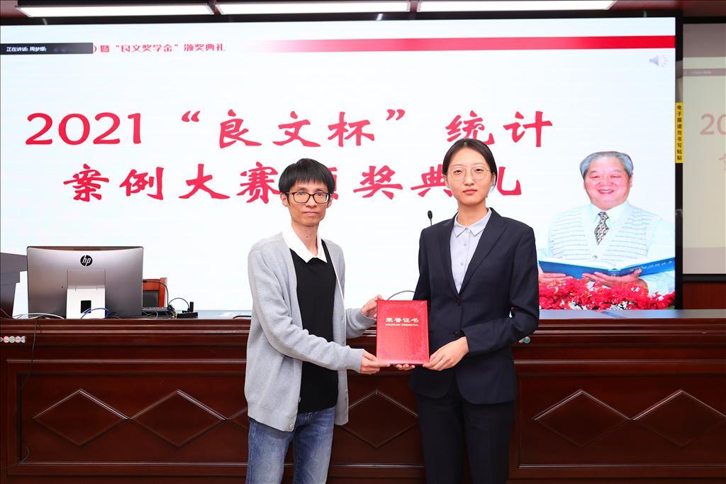 今年论坛的一大亮点是增设了“良文杯”统计案例大赛环节。作为今年黄良文讲坛的主要学术活动之一,案例大赛于2021年6月启动报名,面向全校各专业、各年级学生开放。经过评审组的综合评选,共有五支队伍入围决赛,并在今年的黄良文讲坛上做决赛PPT展示和现场答辩。综合各参赛队伍提交的文稿及决赛现场展示,评审组宣布由王译平、孙浩洋组成的“重在参与”队获得大赛二等奖,其余四支队伍获得优秀奖。
