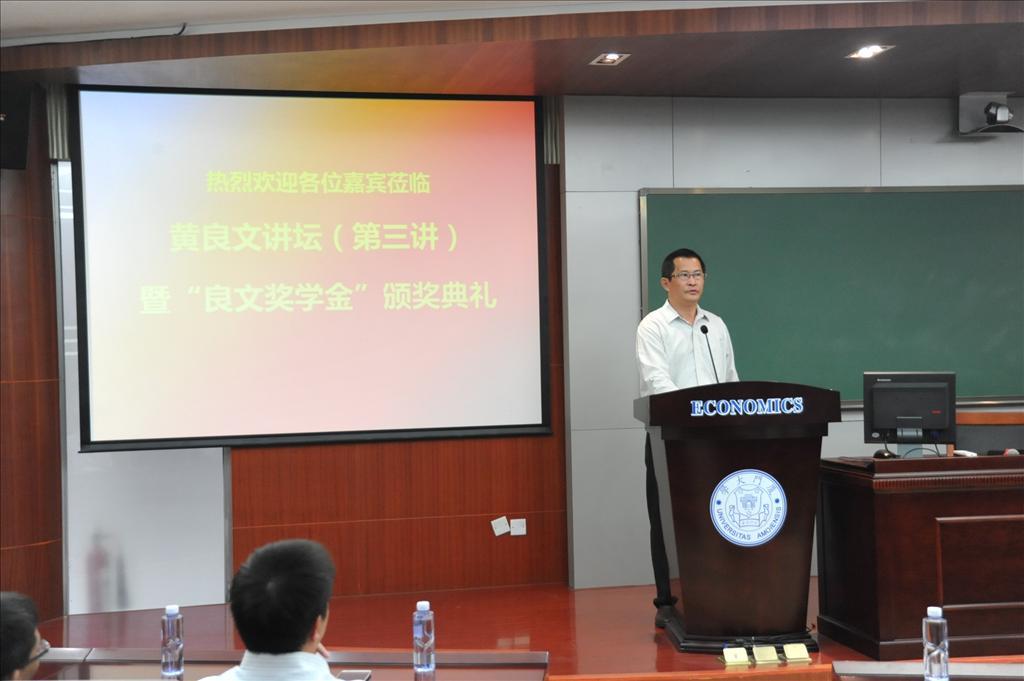 “黄良文讲坛”旨在通过学术活动促进统计学科的建设与发展,为校友、系友搭建了一座与统计学科联系的桥梁。2013年“黄良文讲坛”在黄良文教授从教60周年庆典之际创设并举办了题为“量化投资在中国”的首场讲座,于2014年举办了题为“量化投资策略与新发展”的第二讲。2015年,为缅怀黄良文教授“良师益友堪称楷模、文章道德皆为世范”之大师风范,追随和传承他深邃的学术思想,“黄良文讲坛”(第三讲)如期开讲,并获得了广大师生的支持。