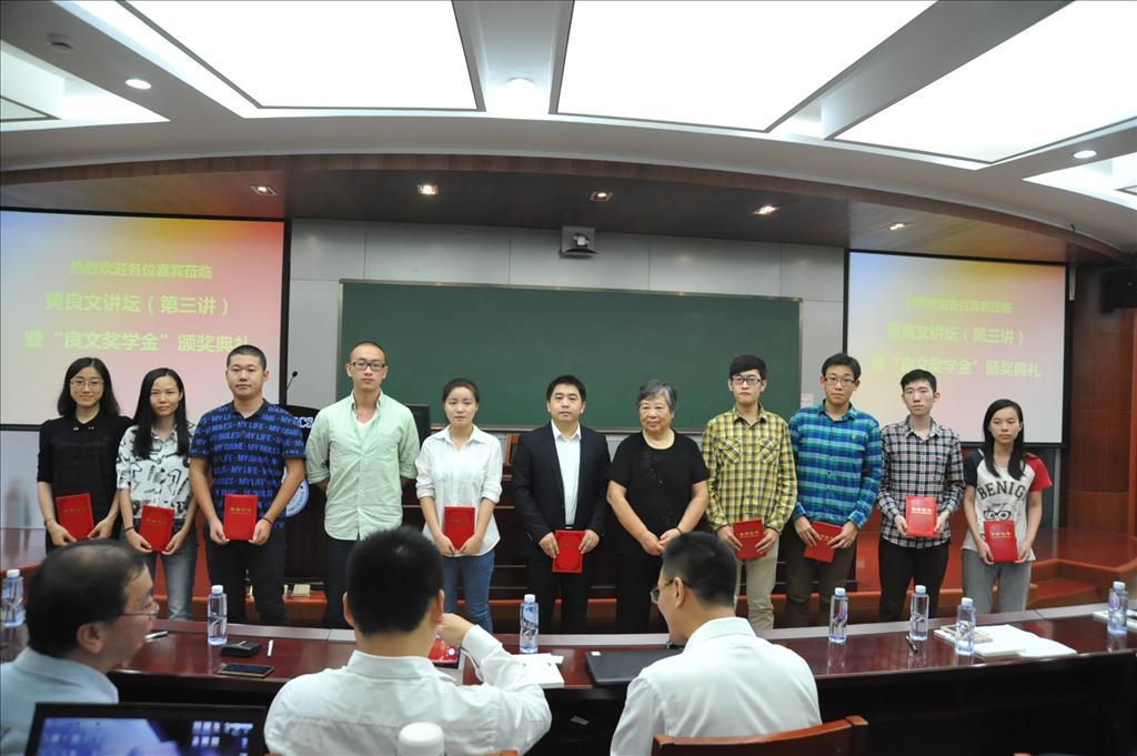 随后是“良文奖学金”的颁奖仪式。唐礼智教授宣读了“良文奖学金”的获奖学生名单,并对获奖者取得的优异成绩进行了表彰。陈金菊女士亲自为获奖者颁奖,并对获奖同学及全体同学表示了殷切的希望和真诚的祝福。同学们以热烈的掌声表示了感激与敬意。