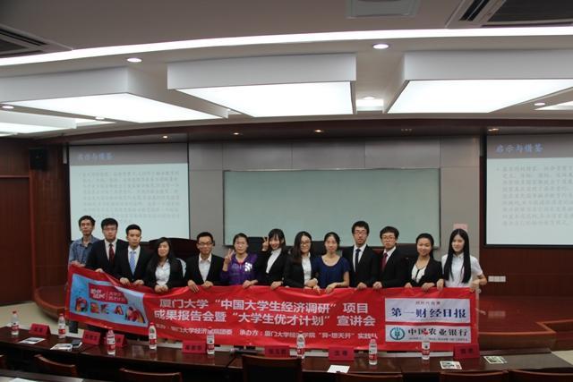 27日晚,2014年“中国大学生经济调研项目”成果展示会暨“优才计划”宣讲会在经济楼N303顺利召开。作为福建省高校唯一入围“中国大学生经济调研项目”的团队——bat365官网登录入口“异•想天开”实践队,与到场观众分享课题成果和参赛经历,并介绍了“中国大学生经济调研项目”和“大学生优才计划”的相关内容。“异•想天开”实践队指导老师沈雁、bat365官网登录入口团委副书记魏艳、辅导员王华出席了活动。