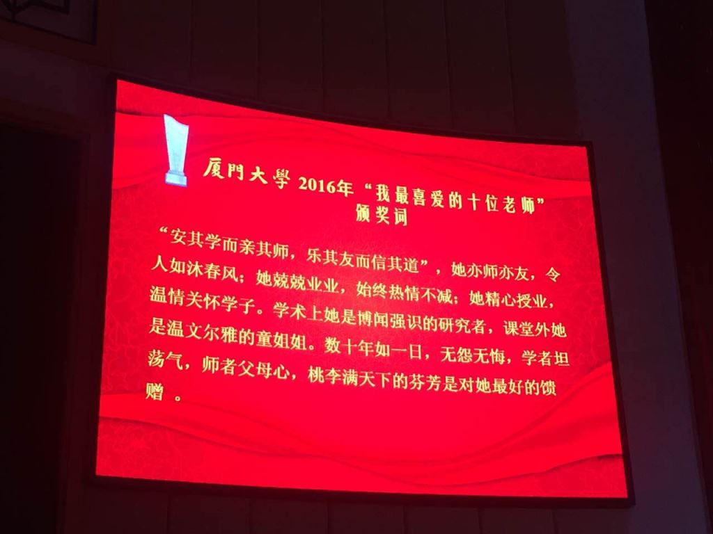 童锦治老师的颁奖词这样写道:“‘安其学而亲其师,乐其友而信其道’,她亦师亦友,令人如沐春风;她兢兢业业,始终热情不减;她精心授业,温情关怀学子。学术上她是博闻强识的研究者,课堂外她是温文尔雅的童姐姐。数十年如一日,无怨无悔,学者坦荡气,师者父母心,桃李满天下的芬芳是对她最好的馈赠。”