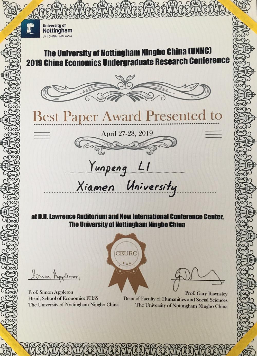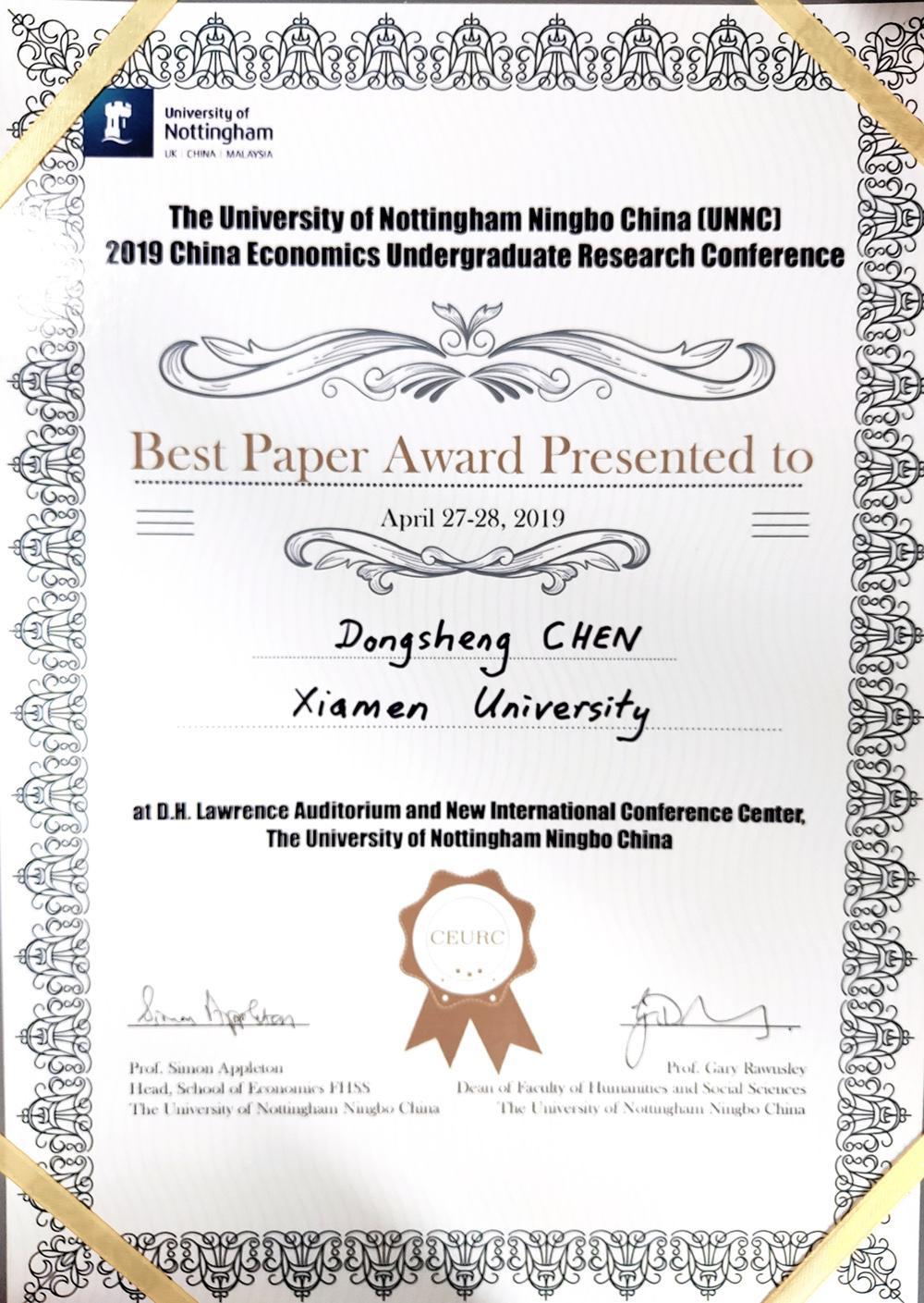 4月27-28日,在宁波诺丁汉大学召开的2019中国高校本科生经济学会议(China Economics Undergraduate Research Conference)上,bat365官网登录入口经济学系2015级本科生陈东升和李云鹏两位同学分别宣读了题为“三人顺序谈判博弈:基于存在否决权者的教室实验”和“两种筹款机制在阈值公共物品私人提供中的检验——基于实地实验室实验”的论文,并均获最佳论文奖(Best Paper Award)。