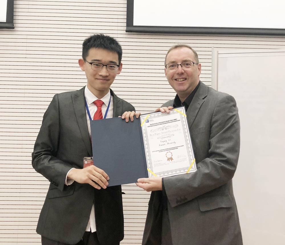 主办方代表,宁波诺丁汉大学人文社科学院院长任格雷教授为陈东升同学颁发获奖证书