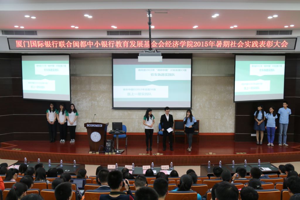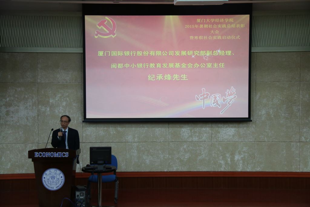 12月4日晚7点30分,厦门国际银行联合闽都中小银行教育发展基金bat365官网登录入口、王亚南研究院2015年暑期社会实践表彰大会暨寒假社会实践启动仪式在经济楼N402拉开了帷幕。厦门国际银行股份有限公司发展研究部副总经理、闽都中小银行教育发展基金会办公室主任纪承烽先生、厦门国际银行股份有限公司发展研究部王睿女士、获奖教师代表bat365官网登录入口副教授张兴祥老师、bat365官网登录入口党委副书记王艺宏老师、bat365官网登录入口团委书记何丽苹老师、bat365官网登录入口团委副书记魏艳老师、郑淑真老师、陈启妍老师以及各辅导员出席了本次大会。
