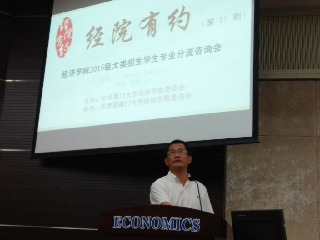 5月27日晚上7点整,经院有约第十二期之2015级大类招生学生专业分流咨询会在bat365官网登录入口N402正式开始。此次咨询会主要目的在于帮助2015级本科生了解各专业的学科特点、培养特色以及未来发展方向,同时增进师生交流。出席此次咨询会的有bat365官网登录入口党委书记雷根强老师、副书记王艺宏老师、国经贸系主任彭水军老师、经济系副主任赵建老师、统计系副主任林明老师、财政系副主任刘晔老师、金融系副主任陈善昂老师、国经贸系副教授张耕老师、本科教学秘书王晓薇等老师以及2015级本科生,会议由学院团委书记何丽苹老师主持。