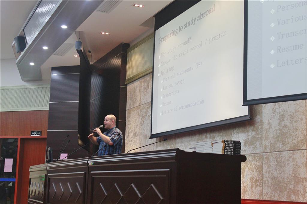 接下来,拥有11年中外高校从教经验、熟知中外文化教育差异的Chris White老师用自己多年来在教学上积累的事例与经验,向同学们开展了一场风趣的讲座,同时也为同学们的人生道路做出三点规划:Be pro-active, Get a head start, Market yourself。他希望大家发掘自己的潜能,实现自己的人生价值。幽默诙谐的语言,在英文演讲中偶尔夹杂中文,赢得了同学们阵阵掌声。