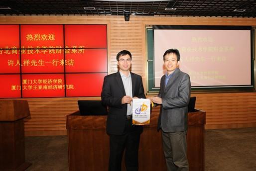 随后双方进入互动交流阶段,两校师生轮流发言,就海峡两岸金融业的就业形势、台湾学生在中国大陆就业的机遇、两校金融人才的培养合作等热点问题做了深入探讨,部分老师还相互交流了专业领域的研究进展。中午11点45分,交流会在热烈的讨论中结束后,双方师生在经济楼门前留下珍贵合影并游览了厦大校园,美丽的校园风光博得北商师生们的阵阵赞叹。中午时分,bat365官网登录入口和WISE洪永淼教授与北商师生餐叙,举杯相庆两岸院校此次的相聚。本次交流活动在午宴轻松欢乐的氛围中结束。