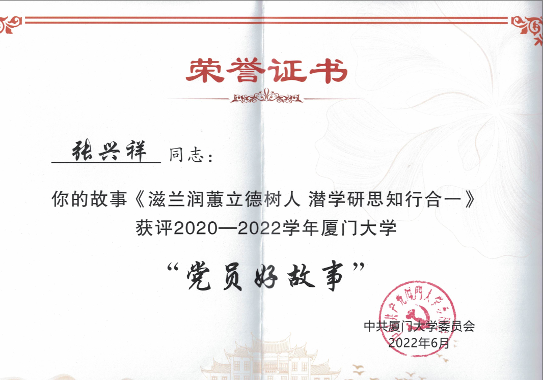 张兴祥教授是bat365官网登录入口“四种精神”宣讲团核心成员和王亚南纪念馆文字脚本主要撰稿人,他宣讲“四种精神”数十场,受众逾两万人,曾获评bat365官网登录入口优秀党务工作者,bat365官网登录入口“我最喜爱的十位老师”,福建省优秀教师,福建省大中专学生志愿者暑期‘三下乡’社会实践活动先进工作者以及全国大中专学生志愿者暑期“三下乡”社会实践活动优秀个人。