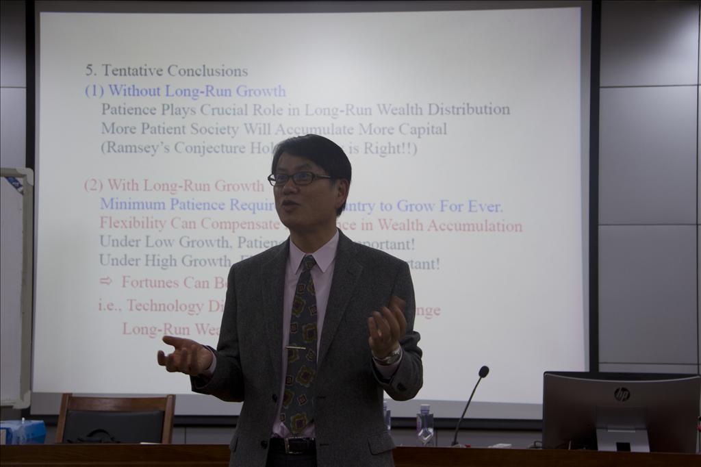 讲座中,中村保教授通过建立一个包含两个国家的拉姆齐模型,在技术是否自由扩散以及资本能否自由流动的两个假设下,分析了两国间消费者的耐心程度以及对待风险态度的差异对两国资本增长、财富积累以及经济增长的影响。研究表明,如果经济长期处于稳态状态,那么,两国间消费者耐心程度的差异将决定两国间财富的不同分布:消费者越有耐心的国家最终将积累越多的财富。这印证了Ramsey(1928)的猜想以及Piketty(2014)的结论。然而,两国若在长期都实现了可持续增长的情况下,消费者对待风险的态度和其耐心程度对一国财富的积累具有相互补偿的效应:经济处于低增长时,耐心程度对财富的积累依然是十分重要的;经济处于高增长时,消费者对待风险的态度、是否愿意平滑消费对财富积累的影响要更大。特别地,如果技术可以在两国间自由扩散,那么,经济高增长时,消费者对待风险的态度可以完全逆转财富的分布。